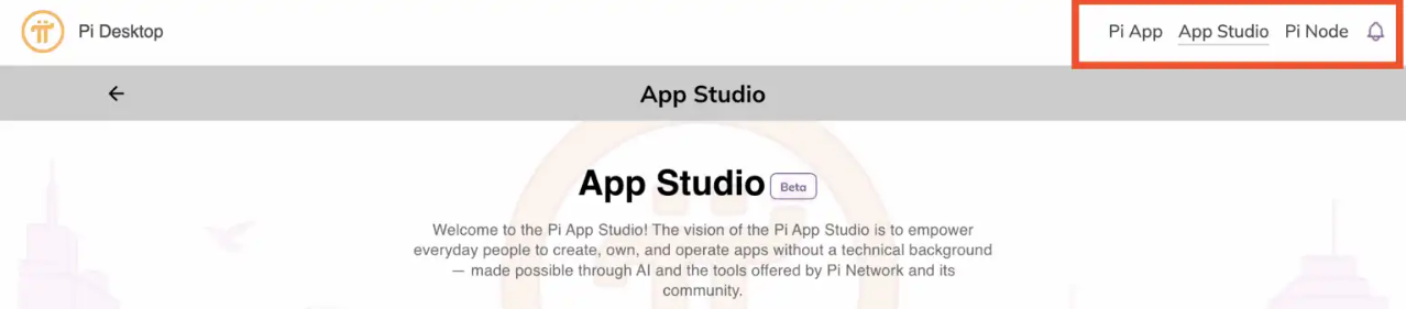 Pi App Studio 现在可从Pi Desktop顶部导航栏直接访问,该导航栏位于 Pi 挖矿应用程序和 Node 旁边。这将取代其之前位于 Pi 挖矿应用程序的“实用程序”选项卡中的位置。